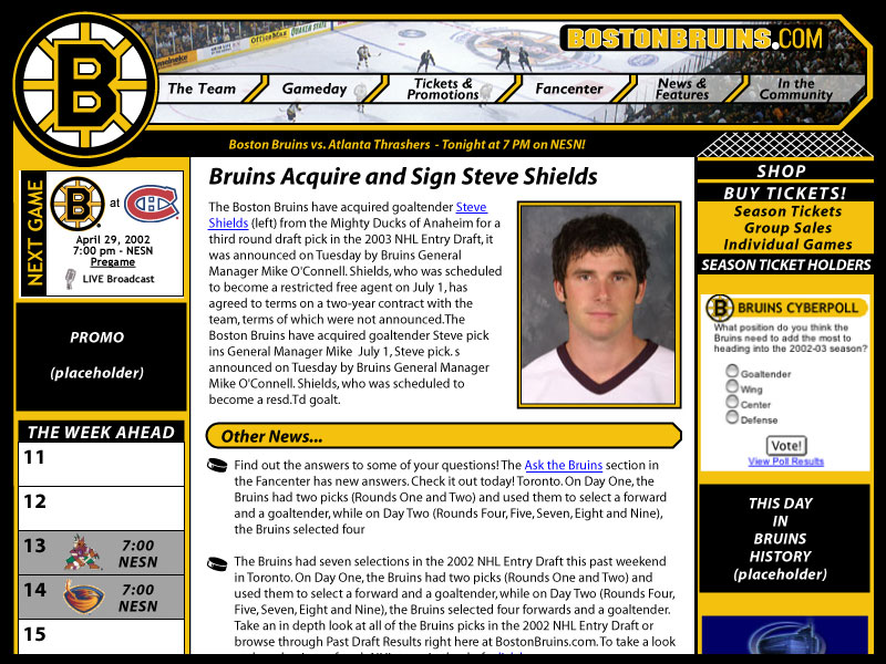 While employed by New England Sports Network, I worked closely with the Boston Bruins' Webmaster to develop this redesign proposal. After meeting with team officials several times and during preparations for implementation of this new design, the National Hockey League took over all the team web pages, giving them a uniform look. While this design never saw the light of day, the team was very happy with it and were prepared to adopt the new look.