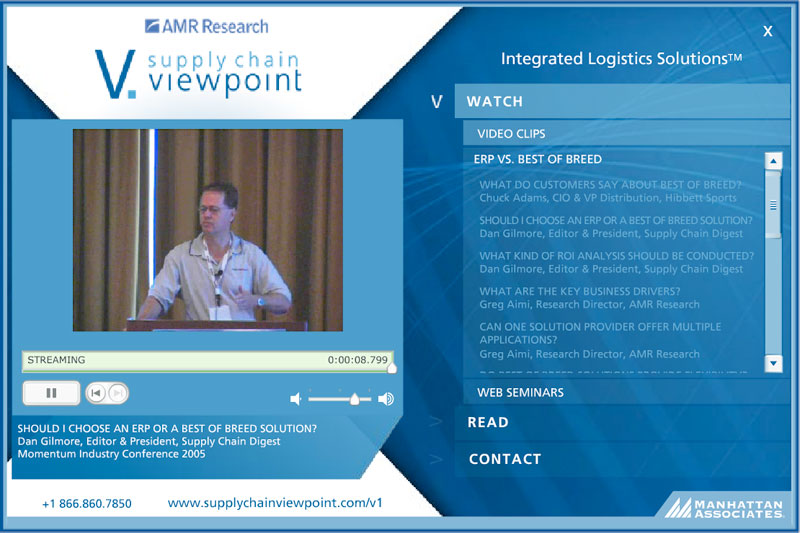 This was a series of seven training CDROMs for employees of Manhattan Associates to learn about the fundamentals of Supply Chain Viewpoint. Each CD had a web connectivity component and if the trainee's computer was online it would load dynamic, up-to-date content into the interface's menus. If not it would load all of the content from the CD directories.